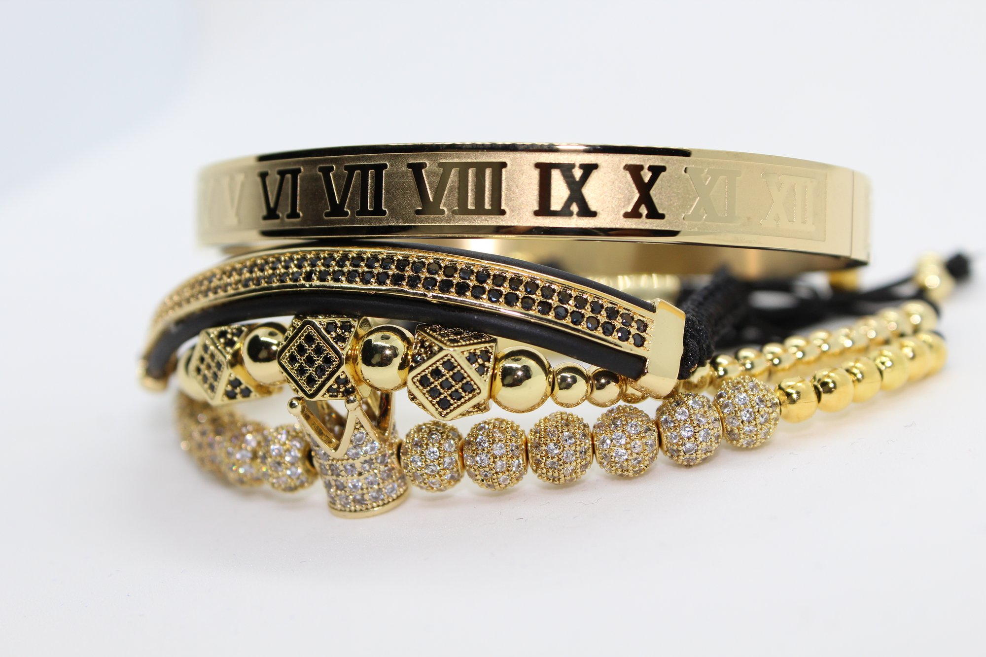 Set de cuatro pulseras para caballero color oro de muy buena calidad. Envios gratis a todo Estados Unidos por correo regular.